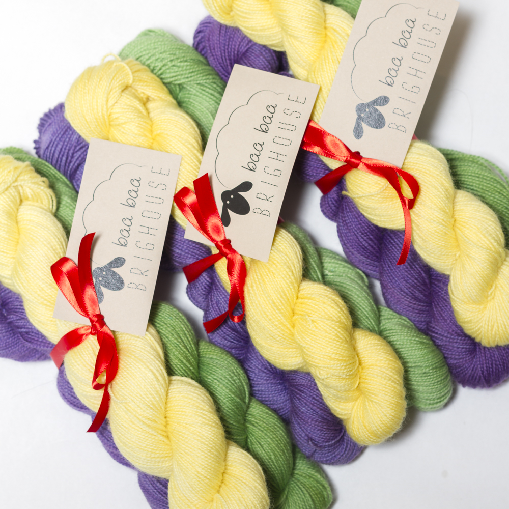 The Spring Crocus Sock Bundle is a limited edition sock yarn set created to celebrate the arrival of spring and the Spring Equinox on Friday March 20th. Each set includes three 50g skeins of hand dyed high twist 4 ply Bluefaced Leicester sock yarn in three different but complementary colourways designed to be used together. All three are semi-solids.